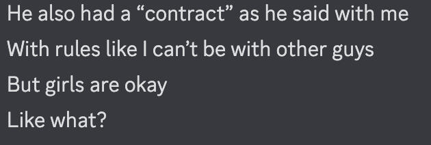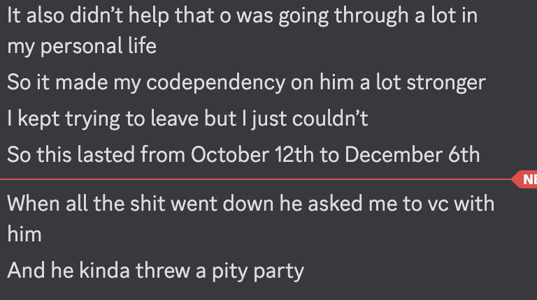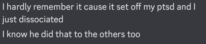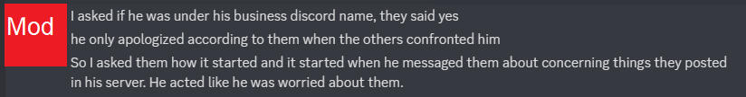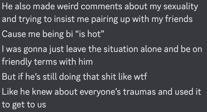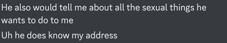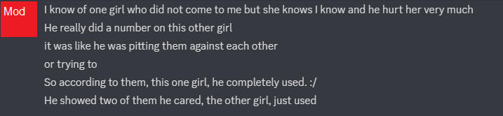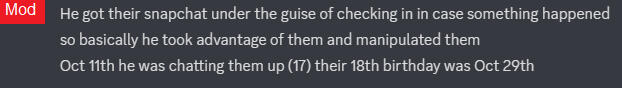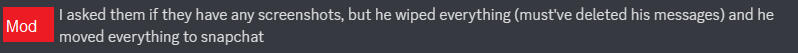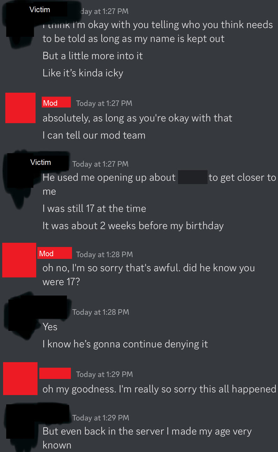 The following screenshots are from the victim, unless otherwise noted as being from the mod they were confiding in.Though they wish to remain anonymous, they gave permission to be shared with you all.